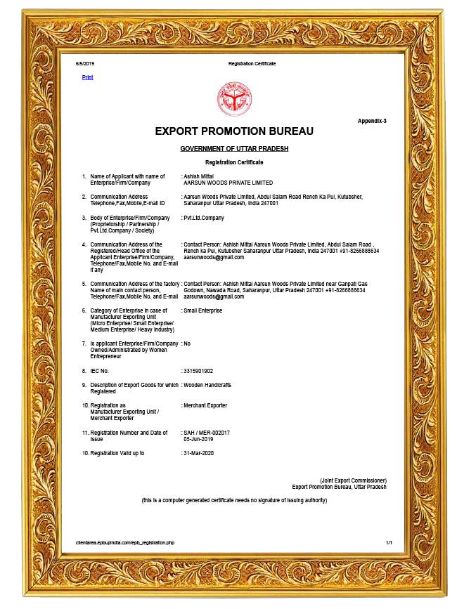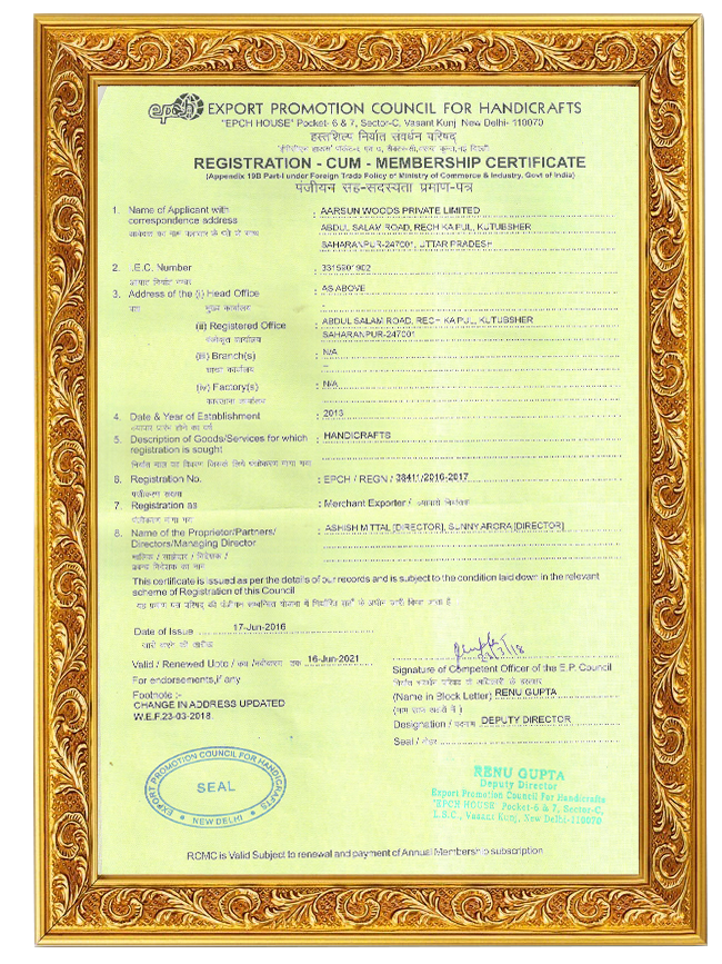 Aarsun Woods is one of the most awarded companies in our category, recently awarded by Honb’l Governor of Uttarkhand – Lt. Gen (Retd.) Sh. Gurmit Singh Ji for our distinguished service in Handicraft promotion and Employment Generation in 2023.