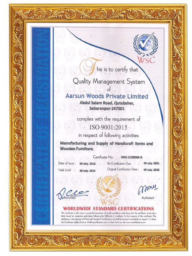 Online wood furniture industry has grown sharply over these years and we offer our unique furniture range to our clients with our online store – aarsunwoods.com. We are an ISO 9001:2015 certified company producing quality products and decorating homes globally. Number of Home Decorators, Architechts and Interior Designers has tie-ups with Aarsun offering the unique and new decoration ideas to their clients fulfilled by Aarsun.