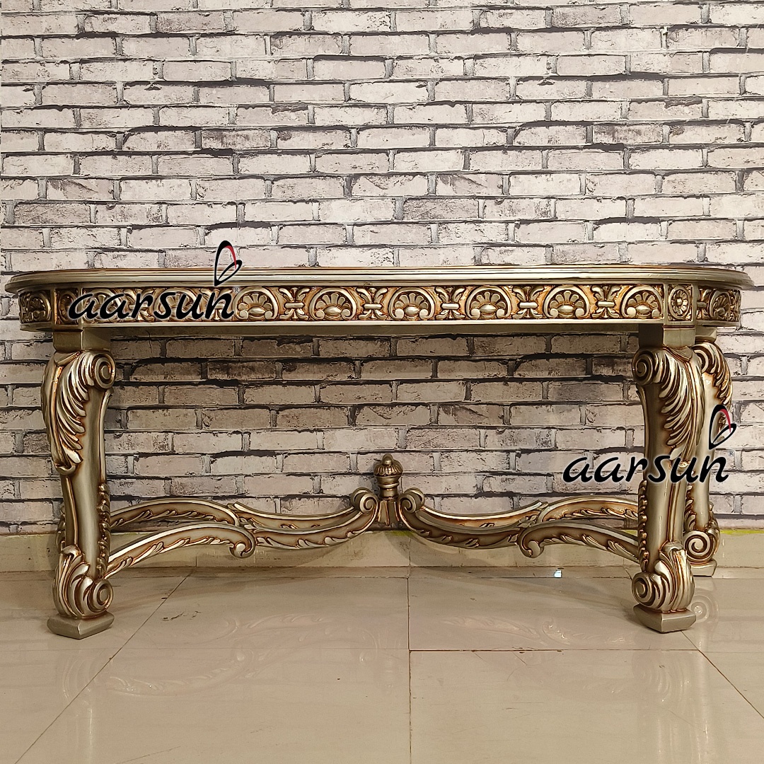 Console tables are in use for a long time for home decoration and Aarsun has the top designer collection for wood console tables designs. Solid Teak wood and Sheesham wood console tables in classical designs that are used for table decoration articles and display items like trophies, insignia, artwork, photo frames. Console tables are used with and without mirrors and also is a decorative furniture unit used for vanity furniture, dressing tables and servers also in Dining areas.