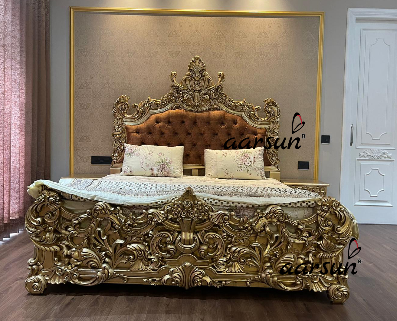 Heavy Carved Gold Finish King Size Bed for Luxury Homes