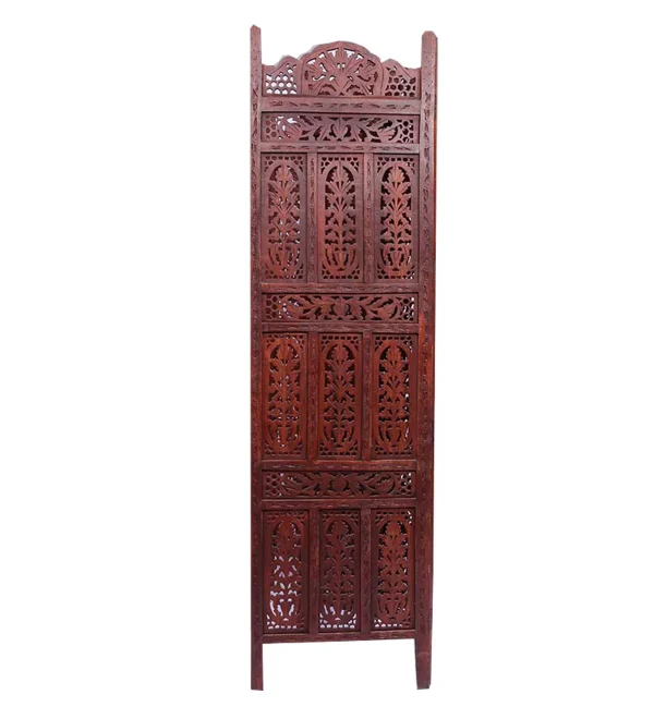 Aarsun brings to you this Handmade 4 Panel Room Divider made from Sheesham Wood with beautiful jaali work that gives an elegant and traditional look (matte finish) to your living room. Consists of 4 Panels each of 72″ Height and 20″Width. This stylish partition separates the living room area from the rest of the house or can be used for separating Puja Space from the rest of the house. Add a classy feel to your living room. A number of designs available in premium wood. It can be customized as per your requirements. Contact us in case you need any other size or design.