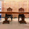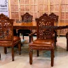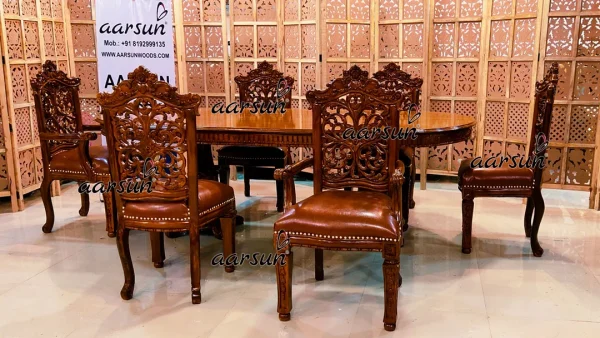 The chairs are double carved and are upholstered seats as per the buyer’s choice of color perfectly. Wider than most dining seats. The table has a double pillar design.
