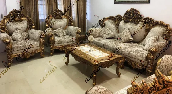 Aarsun brings to you a modern and comfortable Teak Wood Maharaja Sofa Set for your living room. The 7 seater sofa set is made of premium quality Teak Wood with both sides of floral carving. It has an elegant design that enhances the interior decor of your living room.