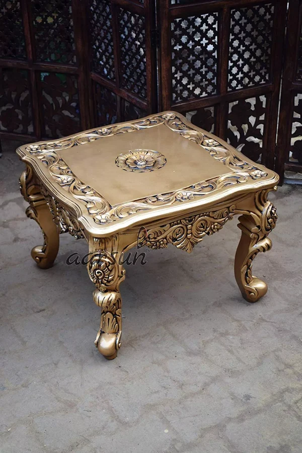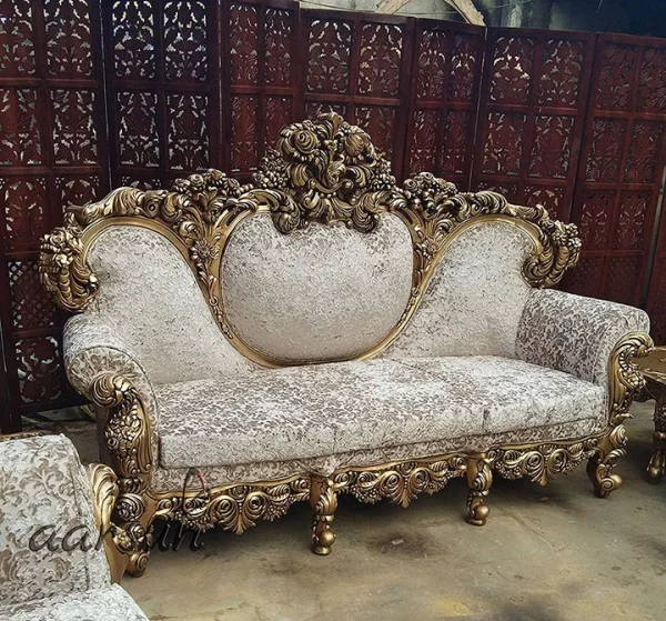 The upholstery of this sofa makes it very comfortable to sit at home, while the floral carving back gives the traditional look to the set. The front base consists of floral carving similar to the upper back. The unit is supported by four beautifully carved legs.