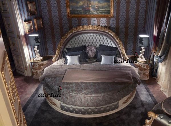 Aarsun brings you a beautifully carved round bed. The bed has garland carving on top of the heardboard and tufted fabric which makes this a royal set. The headrest and footrest are tufted with amazing grey silk fabric. Our skilled artisans also incorporate intricate carvings on the sides of the bed. For more designs click here.