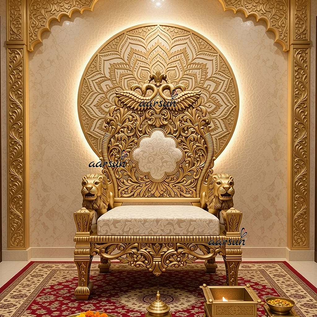An Antique Gold Guruji Chair Singhasan that you will love to have at home for your diety or your Guru Ji Maharaj. This chair will give a luxurious and peaceful vibe to the home interior. This design is specially customized as per the client’s choice.