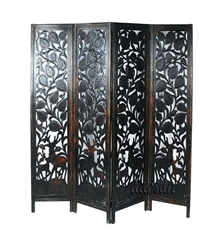 Aarsun brings to you the Antique Wooden Partition Screen in fine quality wood with fine carving and finishing. There is beautiful leaf & Deer carving done by our skilled artisans. The unit consists of four panels and can be placed in the Zig-Zag position. Each panel comes in a standard size of 72″ x 20″ and you can easily handle it anywhere in your home.