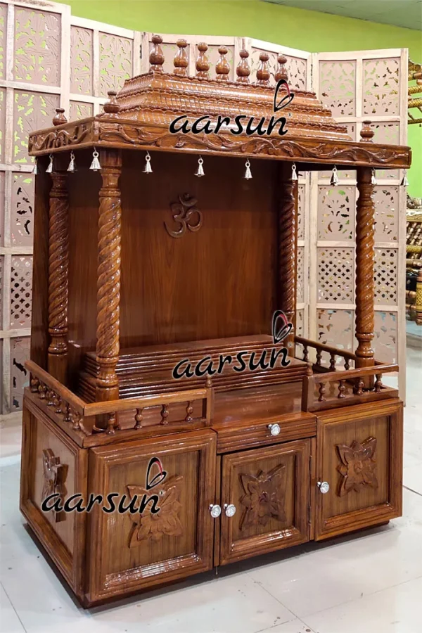 At Aarsun, each unit is customized as per your home requirement. The Shikhar at the top can be removed as per your requirement. Even the Steps inside the Garbhagriha can be removed as and when required. The whole mandir is polished in natural polish which enables the natural wood grains to be visible. The natural wood grains have their own texture distinctive to each log of wood. Hence, apart from being unique because of the fact that it is handmade, nature herself has bestowed the mandir uniqueness that is rarely seen in the modern world.