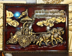 Aarsun brings you an epic Mahabharat wall art with golden highlights. This wall mount painting is inspired by the Mahabharat and includes a shloka in it. In this wall art, you can imagine the scene from the Mahabharat where Krishna serves as the charioteer for Arjun during the epic battle. The chariot, drawn by horses, also has Hanumanji seated on top. The flag (Dhawaj) looks amazing. This is a 3D model, meticulously carved by machine in MDF and painted in dark shade. Our designer developed the design, which was then finalized and produced by the machine.