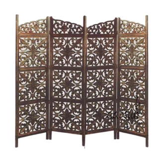 This is a Handmade Folding Room separator/ Partition from Aarsun made out of Mango Wood & MDF, trendy flowery art (it gives the living room a traditional, matte finish look). Comprises of 4 Panels each of 72 inches in Height and 80 inches range( approx.). This classy divide uses space to create a divide between the living room area with the other area or is also capable of being used to create a divide between the pooja space with the other space.