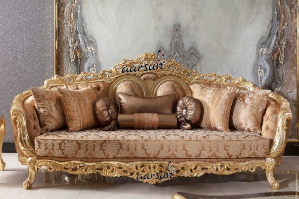 Aarsun promotes to you Handcrafted Maharaja Gold Polish Sofa Set for home. Throughout this beautiful furniture piece, you will find carvings that lend an old-world charm and elegance. The Wooden Sofa Set designs have also been modified to suit everyone’s requirements. This Handmade Wooden Nawab Style Sofa Set is made with premium quality Solid Wood.