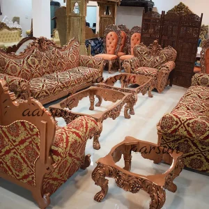 Aarsun presents this luxurious European-style sofa set from our exclusive sofa set collection. It has a seating capacity of five. It comes with one center table and two side tables. It is a blend of modern and traditional European carving. It is done with a floral pattern. It is made up of premium-quality teak wood, which is known for its timeless durability, beautiful grains, and strength. It is finished with the gold and silver deco paint, with, cushioning part done with high-density foam covered with mint green fabric. The backrest of the sofa is done with a quilted pattern, which gives it a luxurious look. It is completely customizable as per the client’s requirements.