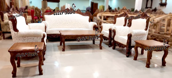 Aarsun brings to you a modern and comfortable wooden sofa set for your living room. This Sofa Set is made of premium quality Teak Wood with floral carving. It has an elegant design that enhances the interior decor of your living room. The fabric of this sofa makes it very comfortable to sit while the floral carving back gives the traditional look to the set. The unit is supported by four beautifully carved legs.