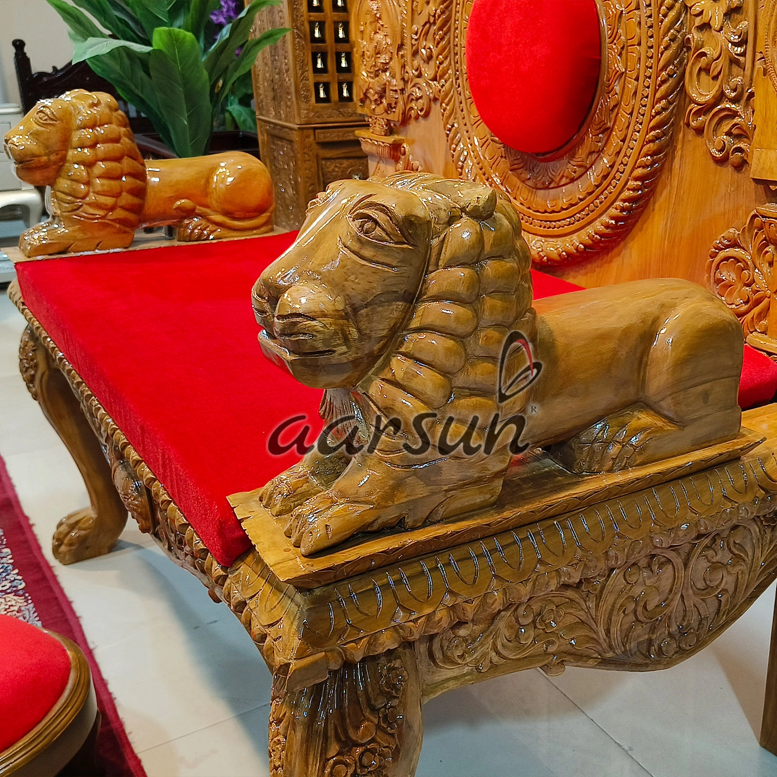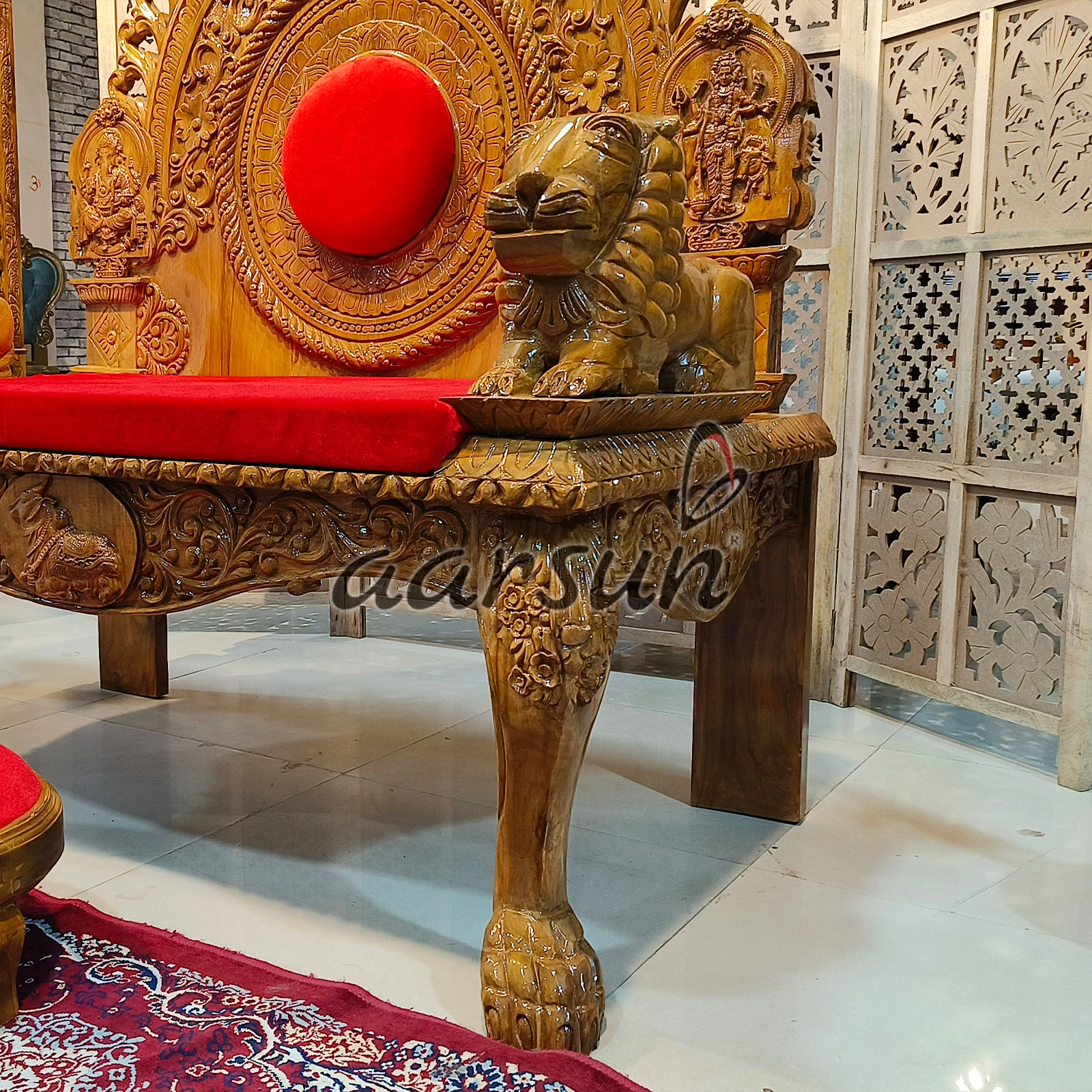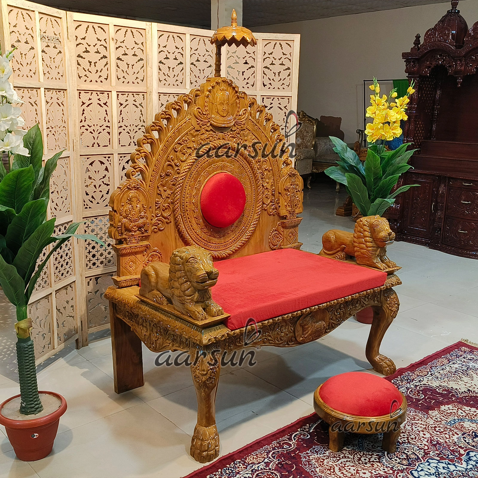 Wooden Singhasan Chair with Lion Arm Design