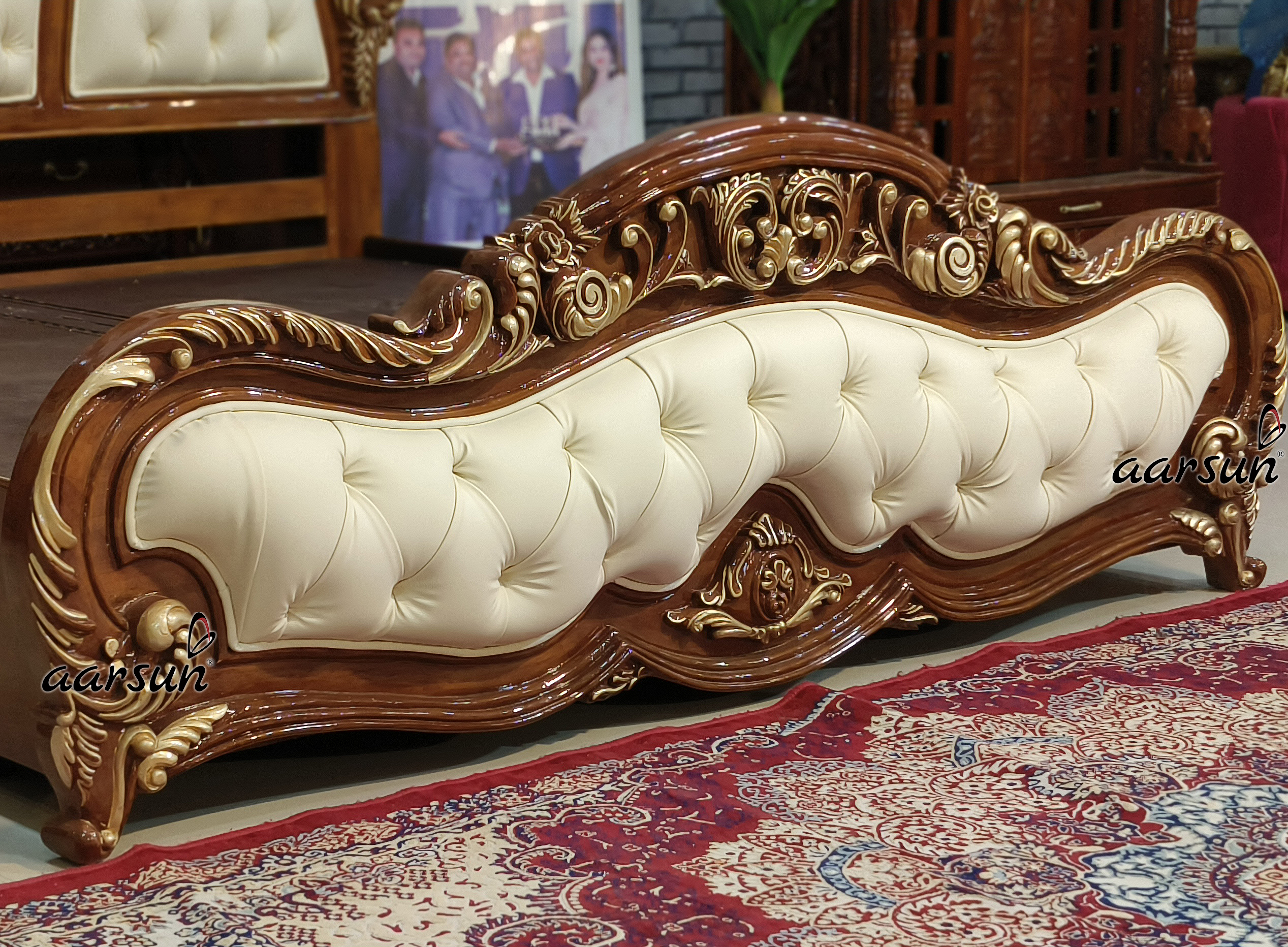 Aarsun’s latest handcrafted king-size bed is here to revamp your bedroom space with its designer look. No need to worry about the quality because we make the bed with solid teak wood that ensures durability. Taking care of the storage part, the bed has hydraulic storage that offers easy opening and closing. The bed is cushioned at the back and tufted in beautiful leatherette upholstery making this bed classy and an elegant masterpiece. With a honey gloss finish and golden highlighting, this makes the bed look different from all other beds. This design is made out of a catalog means we convert the design created by AI or any software into reality. We make what you want, hence we deliver “Choice Wala Furniture” This bed comes in 4 pieces -headboard, footboard, and two storage boxes put together and is therefore easy to install. The Leatherette off-white fabric color adds a beautiful charm to the overall bed. True artwork can be seen in this master bed where the hard work of skilled artisans is invested to make this designer bed. At Aarsun’s we make the furniture as per your choice and provide door delivery.