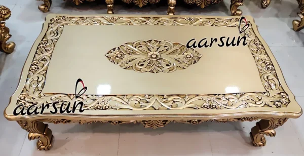 Aarsun presents one more Luxury Sofa Set – a royal and comfortable double carved sofa sets that one can keep in the center of a large hall or in the entertainment room. The Sofa Set is hand-carved in premium quality wood by skilled artisans and painted in Antique Gold paint. The premium fabric amazingly compliments the design.