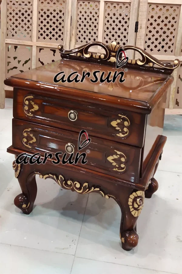 Aarsun presents a handmade Wooden Storage Side Table suitable for homes. The Designer Bedside Storage Table is made from Solid Wood with traditional carving and fine finishing. The unit consists of two drawers for Storage.