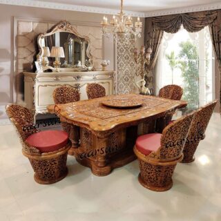 Aarsun presents to you a Handcrafted 6 Seater Wooden Traditional Dining Set made from premium quality wood by skilled artisans. A transitional style Premium Dining set that features a dining table, and 6 chairs with Beautiful carving. It is finished in natural polish for a dazzling appeal. The dining chairs look beautiful and make this dining set unique. The dining room set features a really attractive design. It’s a beautiful addition to the dining room area.