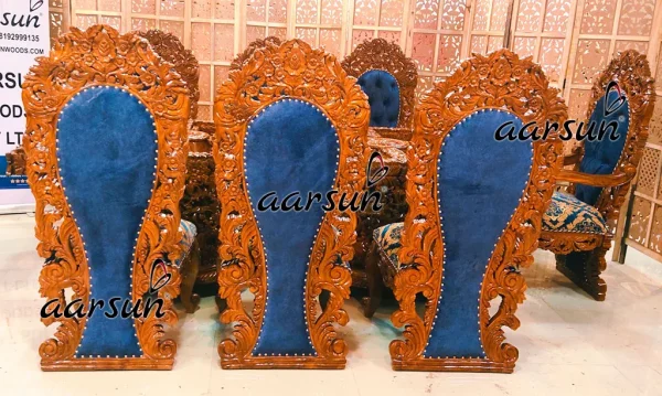 Traditional Fully Hand Carved 8 Seater Dining Set in Honey Gloss Finish from Saharanpur, India. Each chair is a masterpiece and beautifully painted. The Smooth Fabric compliments the frame. The 8 Seater Dining Set comprises of 8 Chairs and a Heavy Carved Large Dining Table.