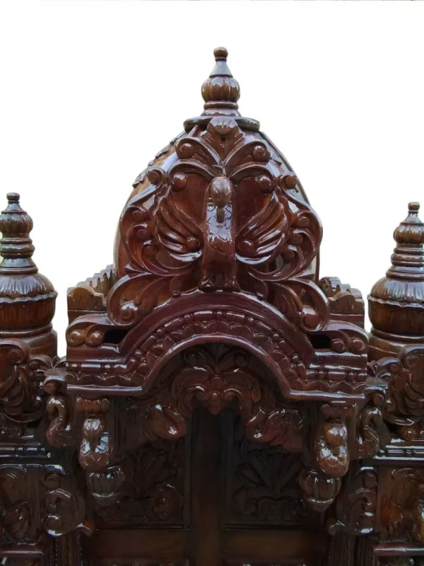 The Home Temple is hand polished in dark walnut color to give the carvings more depth and texture. The unit can be customized to your needs. Even the polish can be changed to natural or gold as you like.