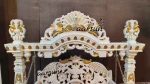 The frame has a peacock design at the top. The whole unit is made of pure solid teak wood and finished with white deco paint with golden highlighting. Every detail is so clearly visible.