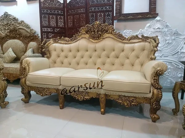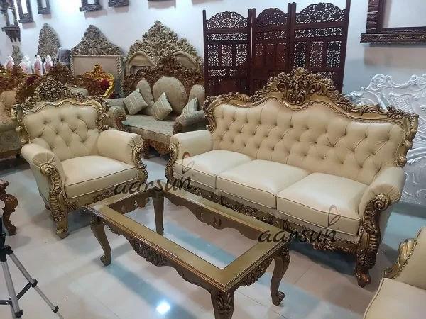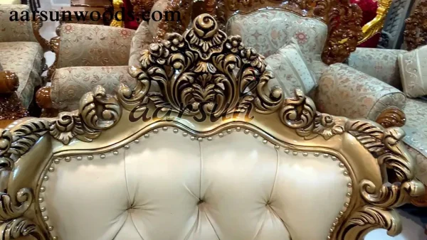 Aarsun presents to you a modern and comfortable Wooden Royal Sofa Set for your living room. The 3+1+1 seater Sofa Set Living Room Carved Furniture is made of premium quality wood with floral carving with antique gold paint. It has an antique design that enhances the interior decor of your living room. This beautiful fully hand-carved wooden royal sofa set is the ideal addition to any home. Crafted from high quality wood and hand-carved with fine detailing. We used high density cushions and lovely upholstery make it the ideal spot in which to sit and relax after a long day. The Sofa set included a three-seater sofa, loveseat, and coffee table, offering ample seating space for friends and family gatherings. The sofa set comes in a range of finishes such as dark, light color, PU finisg, antique gold, rose gold and white deco etc. So you can select the best one to suit your décor.