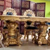 Browse our double carving Premium Dining table with 6 chairs. Designed & Crafted By our skilled artisan. The Luxurious Dining Set is designed in teak wood with antique gold polish as per the customer’s requirement.