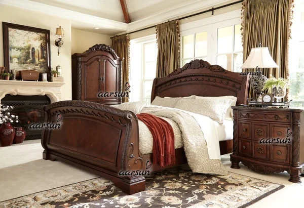 Aarsun brings you a Luxurious Sleigh Bed handcrafted by local artisans of India from premium solid wood in a dark brown colour with subtle light carving.This wonderful piece is a timeless complement to any bedroom as it combines beauty, comfort, and timelessness. In addition to this, as each unit is handmade, this results in a one-of-a-kind experience.The Sleigh Bed is a reflection of luxury and grandeur because of its classic sleigh-style headboard and footboard. The skilled craftsmanship by Indian artisans is clearly visible in the soft curves and exquisite carving. This bed is made of solid wood to ensure durability and longevity.With our custom made Sleigh Bed design you can turn your bedroom into a haven of comfort and elegance.