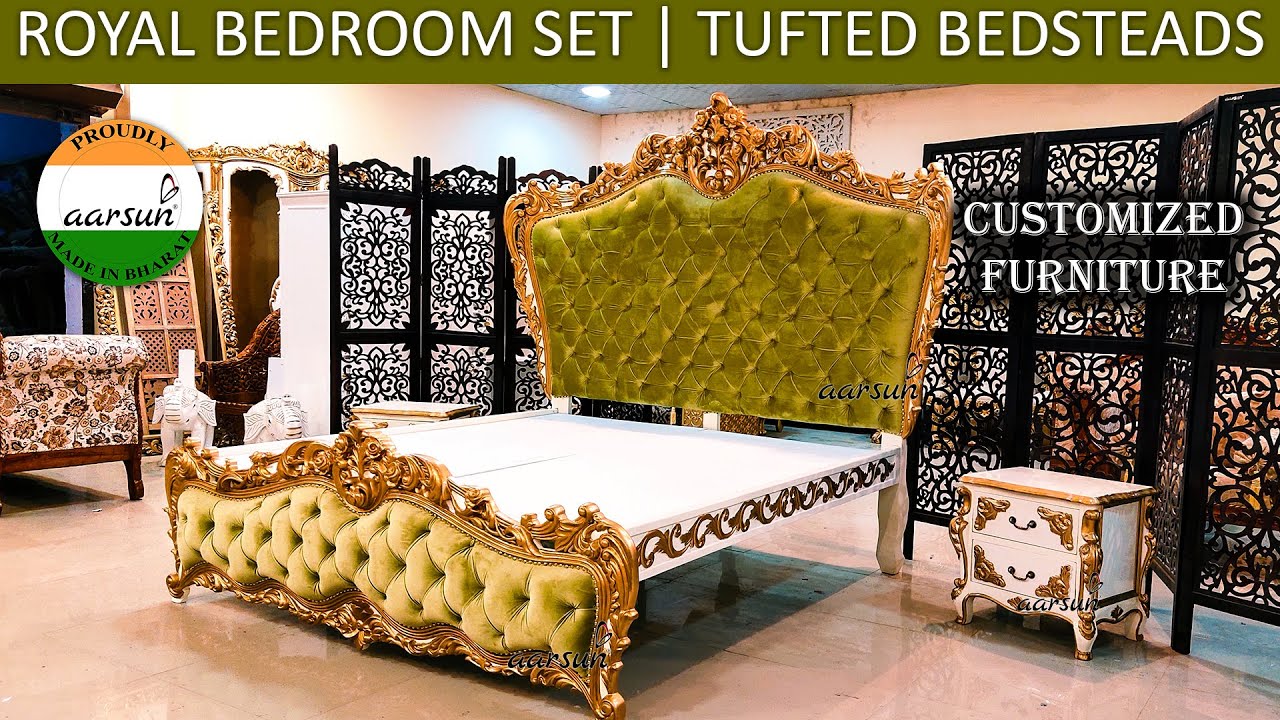 Refresh your bedroom with Aarsun Royal Tufted Bedsteads / Bedroom Set. The teak wood and gold finish means it will last through a lifetime of evolving style. The unit is finished entirely by hand, using a multi-step process that adds carving and uniqueness to the furniture.