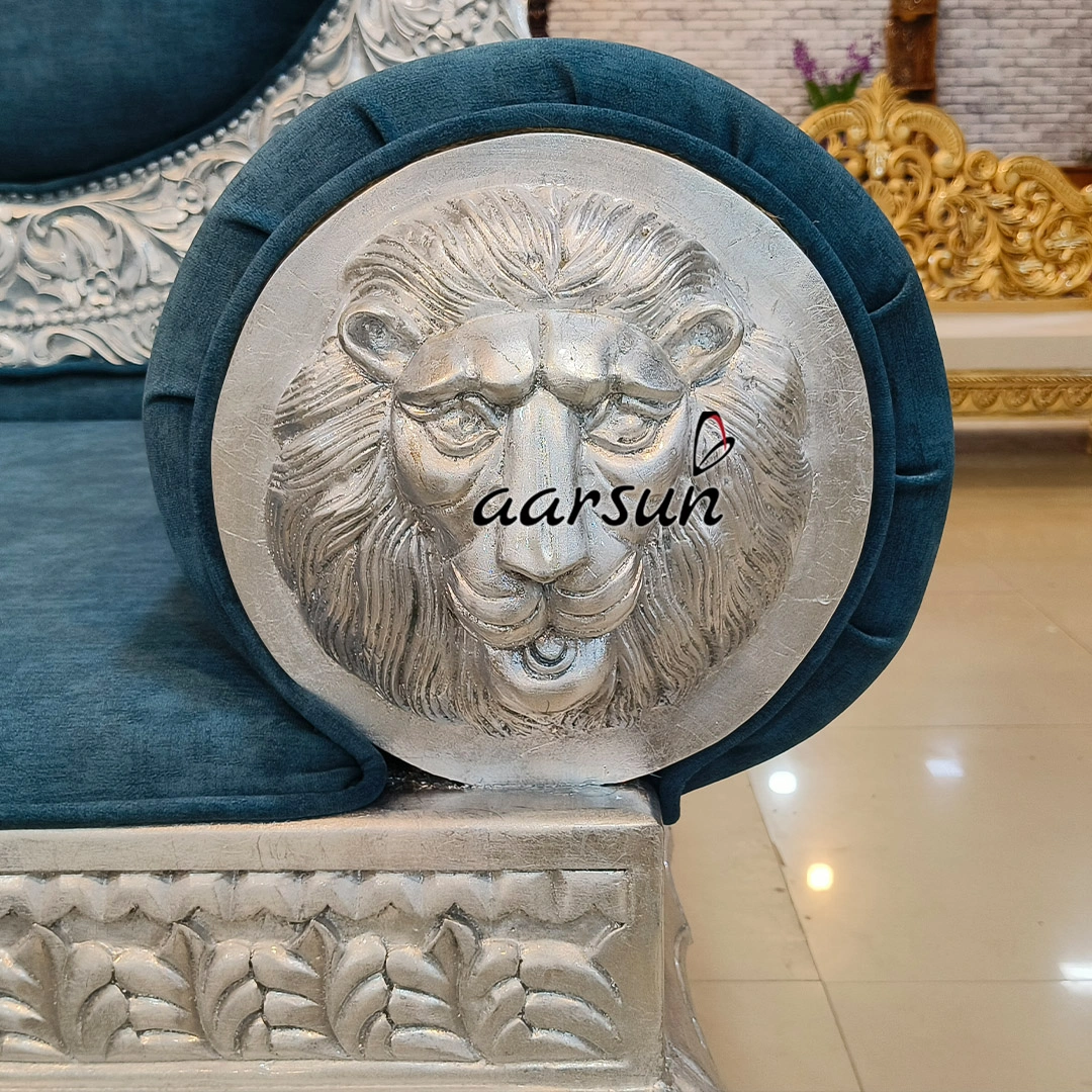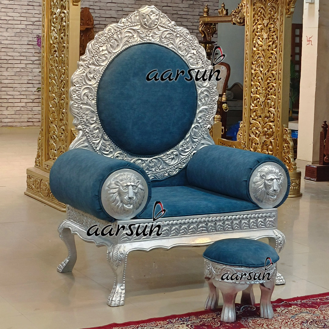 Handcrafted Teak Wood Throne Chair with Silver Leaf Work