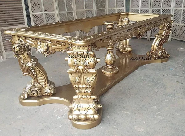 The premium dining set has a grand table frame with thick legs carved out by our artisans with a view to provide a royal feel. Similarly, the dining chairs are double carved in floral wavy pattern. And the antique gold finish brings uniqueness and royalty to the dining set.