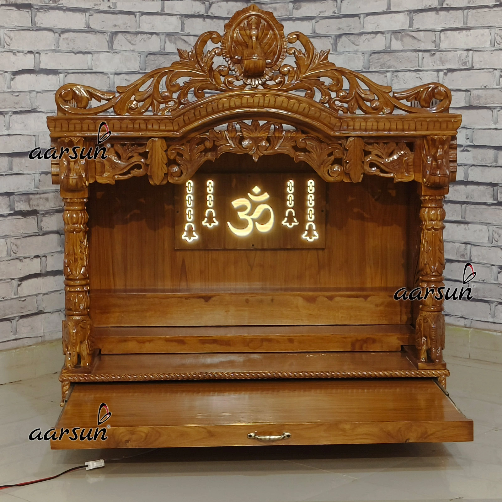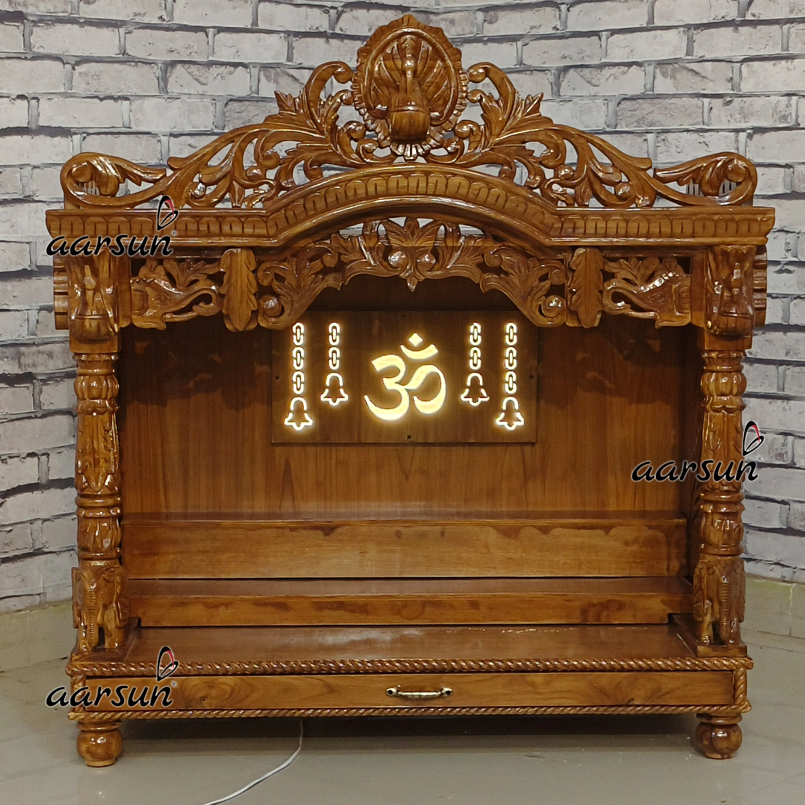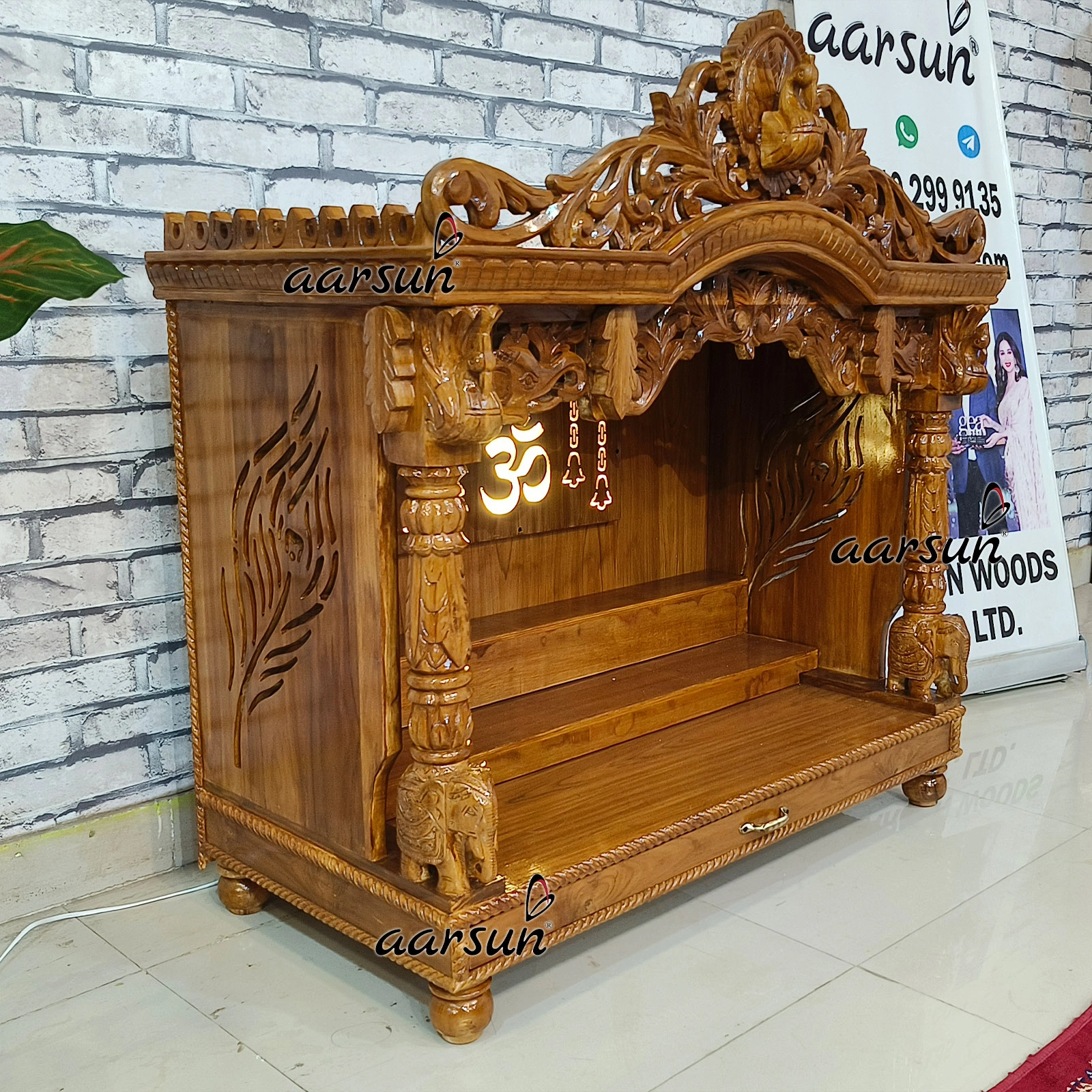 Teak wood mandir with Morpankh Design and Back LED