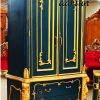 The wardrobe is crafted from teak wood and polished in Persian teal, with a design selected by the buyer from furniture catalog. Golden highlights have been added to enhance its elegance. It offers ample storage space, including drawers with a smooth, soft open and close mechanism. The wardrobe inner area is fully finished in gold and includes a cloth hanging rod. This almirah features a classical Italian design, showcasing impressive leg work and a crown shaped top.
