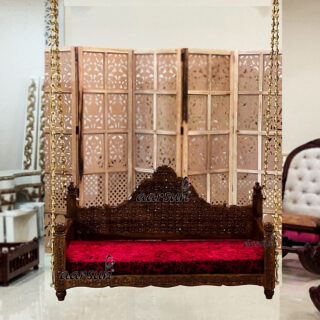 The carved wooden hanging Oonjal, decorate your home with a traditional touch. Talking about the design part on the back support is in rajasthani traditional style carving with a tiny floral pattern, it also complements the red velvett fabric. It is made of solid teak wood and finished with white deco paint with gold highlights, and comes with a pure brass chain, which is very strong. It can be customised as per the client’s requirements.